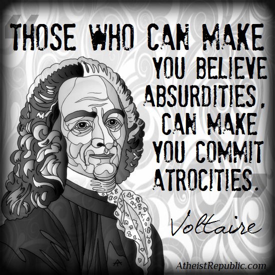 We would do well to remember that every law passed is ultimately enforceable at the barrel of a gun, and therefore it is not moral to use the law as a means of accomplishing anything that is not justifiable to kill human beings to achieve. In other words, if you wouldn’t walk into your neighbor’s house and put a bullet in his brain-pan for taking a drink of alcohol, then it is not important enough to pass a law that would essentially send the police or the government in general to do it for you. If you don’t think it’s moral to steal, then you can’t justify sending the agents of government to steal wealth for you. If you wouldn’t feel right personally dropping a bomb on a village where innocent children might be hiding, then it doesn’t somehow magically become okay because you voted to allow your government to do it in your name.Voltaire  If we look around us today at all the violence that’s being perpetuated against peaceful people by our own government; in the never-ending overseas military excursions which have nothing to do with American self-defense, in the war on drugs here at home which gives police the authority to physically impose themselves on and kidnap (arrest) non-violent victimless ‘criminals’ and incarcerate people who never hurt anybody; we see the consequences of the human suffering, enslavement, and death which ultimately proceeds from the perpetuation of supernatural explanations, religious myths, and god-centered superstitions. It may very well be true that religion is the opiate of the masses, but it can also be the fuel of government-sanctioned witch-hunts, lynchings, and genocide. It is largely up to those of us who genuinely believe in freedom to be the proponents of those ideas which promote freedom. Therefore, we call on natural law instead of supernatural revelations; we promote individual responsibility as opposed to collective salvation; and we seek to safeguard the liberty to seek scientific answers where faith would rather end inquiry. It very much seems to me that the human race as a whole constantly faces the same quandary of questions as have I on an individual level. How we answer as a species will decide whether we advance in our actual understanding of the natural order, or if we substitute superstitious ignorance for actual knowledge and then bare the inevitable consequences for our denial of reality. We may be able to ignore reality for a time, but we will not long be able to ignore the consequences of ignoring reality. In at least some sense, the story of the human race yet to be told will boil down to whether or not we are able to dispense with the primitive superstitions of our beginnings as a sentient life form seeking understanding, or if we will not relegate our mistaken logic to its’ proper place in history as we embrace the light of understanding found in the scientific knowledge of reality. Knowledge is power, and the Bible may actually be accurate to state that the truth shall set you free. Yes, it is important to stand for truth, and I see the truth as being that it is both unreasonable and detrimental to believe in god and/or any other forms of the supernatural.