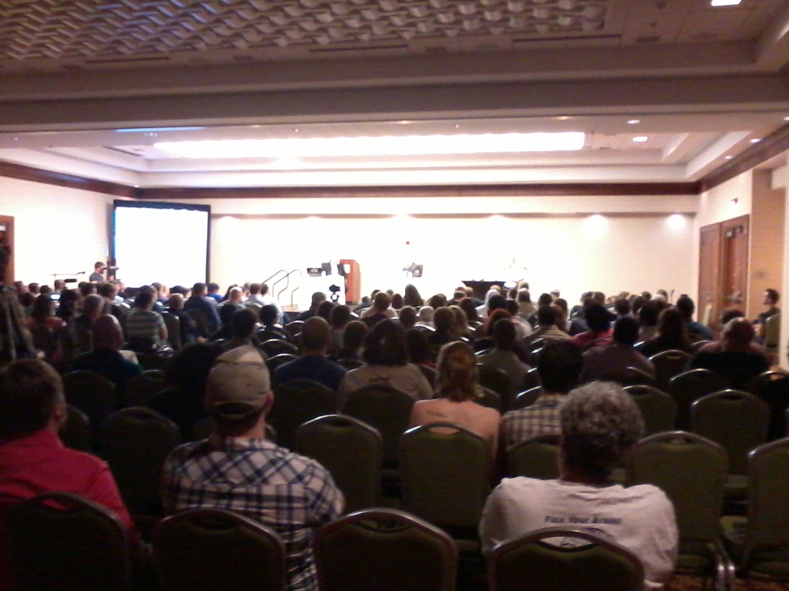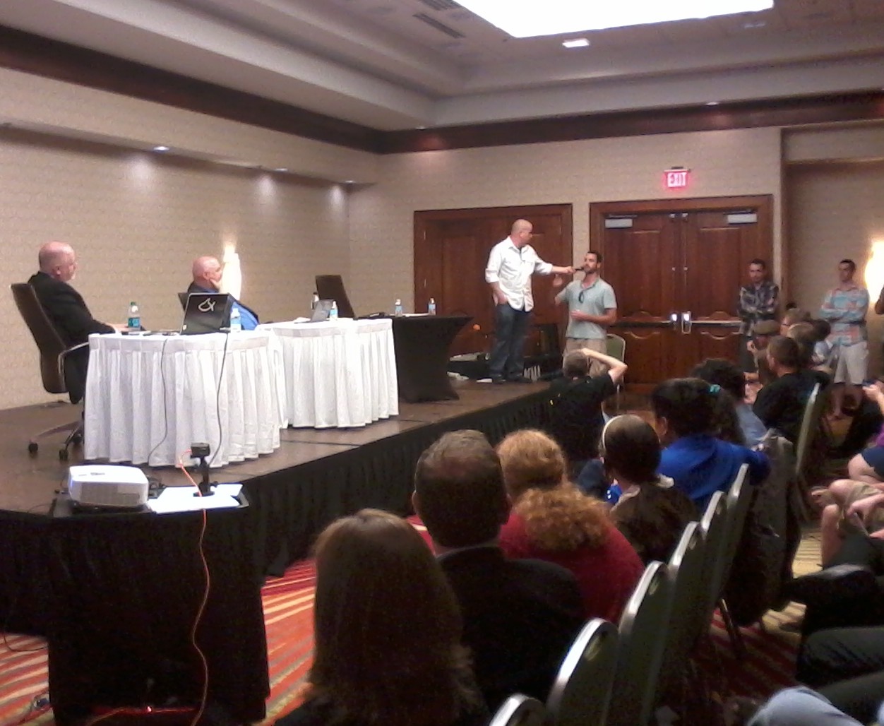 The hotel was nice, the beer was cold and not watered down, the merchant booths were busy, anticipatory conversations about the debate could be overheard all around, the auditorium filled quickly, and the make-shift stage was set – complete with sound, video, lights, props, an overhead projector, and debate opponents poised to reason and retort. Both opponents were afforded ten minutes of opening statements, ten each of rebuttal, followed by several segments of back-and-forth, then 35 minutes of Q&A, and finalizing with 2 to 5 minute closing remarks. Bruggancate started first, giving Dillahunty the final remarks. Bruggencate made several classic presuppositional points and (what this observer would call) circular arguments full of logical fallacies. He used many video clips of Dillahunty from various media over the years, and seemed to be attempting to shift the burden of proof from the position of the supernatural claimer to requiring skepticism to prove the logic of the universal negative. Dillahunty offered what also might be considered classic atheist arguments and already anticipated his opponent’s arguments so well as to have relevant and applicable rebuttal written beforehand, and giving the crowd a brilliant demonstration of the principle of Occam’s razor.