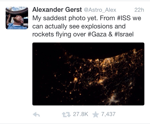 Alexander Gerst has been observing the violence in Gaza from a distance—a distance of 205 miles. The German astronaut, currently aboard the International Space Station, sent out a tweet yesterday describing what he called “my saddest photo yet.”