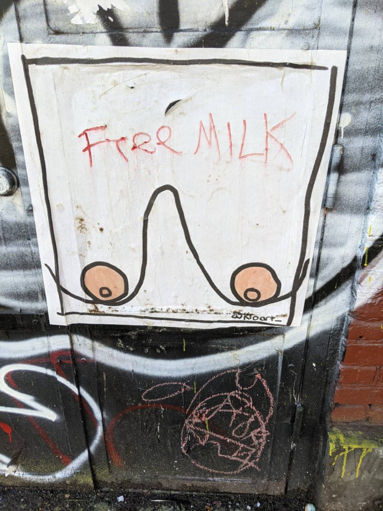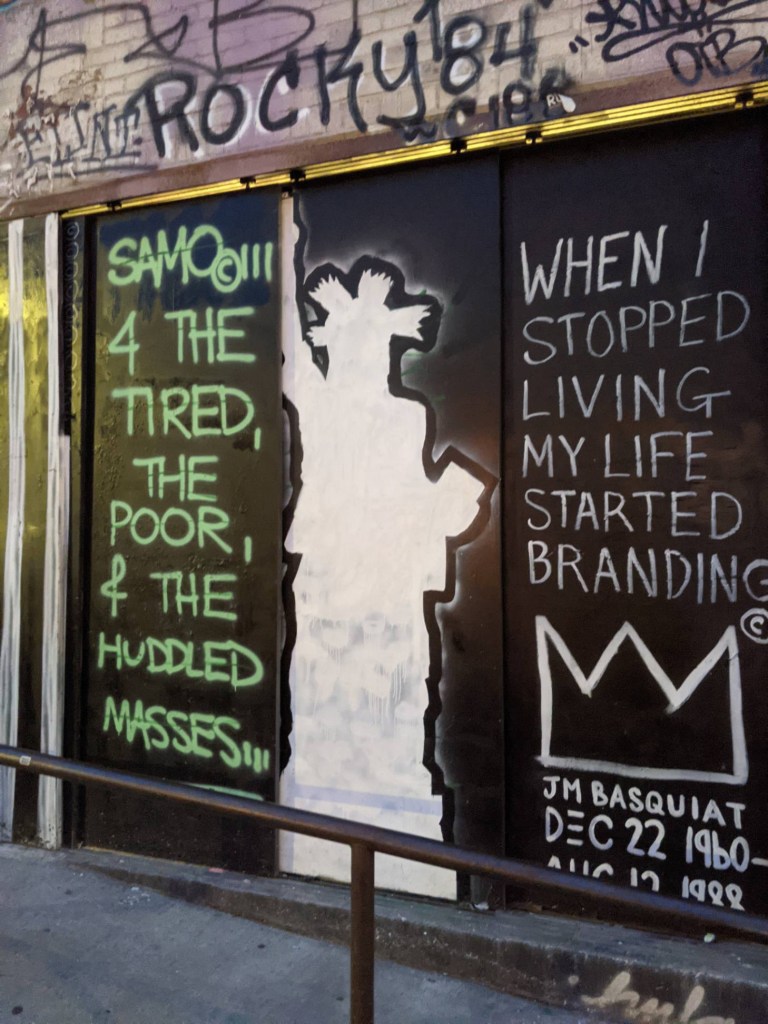 This has been a hell of a year for everyone, and whenever there is any kind of struggle, whether it be political, racial, class, or, as we are experiencing now, pandemic, there is always a robust resurgence of art; and when it comes to the street kind, NYC never disappoints. Some pieces are genius, some are crude, and some are “geniusly crude,” like the primitive drawing I saw of a pair of tits that read, “free milk.” I can spend hours just taking it all in. Of course, I made a couple of ritualistic, planned stops—Basquiat’s Loft on Great Jones, his old apartment on Crosby, and even walked by where Brian used to cop (Bonnie and Albie’s apartment on Ave D)—but there is nothing my soul needed more, particularly after this last year and a half, than to go back to something familiar and fall in love with it all over again.