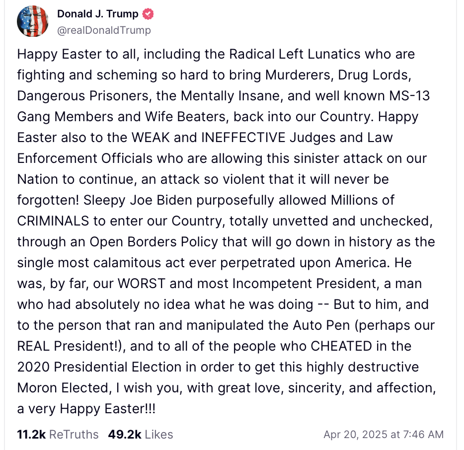 This morning, Donald Trump’s Easter message on Truth Social was a rambling diatribe against “Radical Left Lunatics,” “Mentally Insane” immigrants, “Wife Beaters,” “Weak Judges,” and, of course, the classic finale: a reminder that “Sleepy” Joe Biden is a criminally installed puppet and America is being destroyed by an open-borders conspiracy. It was unhinged and deranged and utterly predictable.